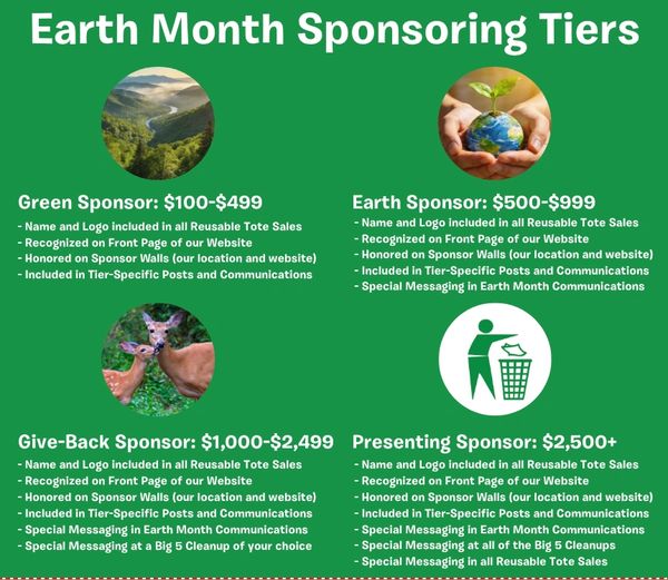 Our Earth Month Initiatives are an open invitation for everyone, irrespective of age, background, or expertise. We believe in the collective power of individuals coming together to make a positive impact! Clean Up - Give Back operates solely on charitable support from organizations and the community. All that we do is made possible by our wonderful sponsors and donors. Please consider Clean Up - Give Back for your charitable donations. Thank you for all of your support!